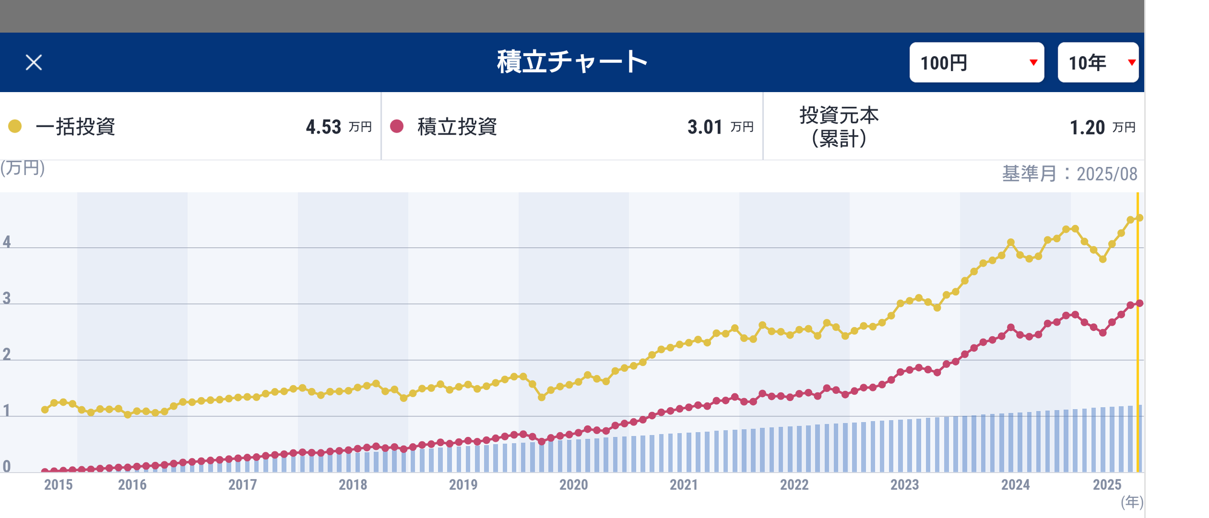 ニッセイ外国株式インデックスファンドに毎月100円を10年積立投資をした結果です。